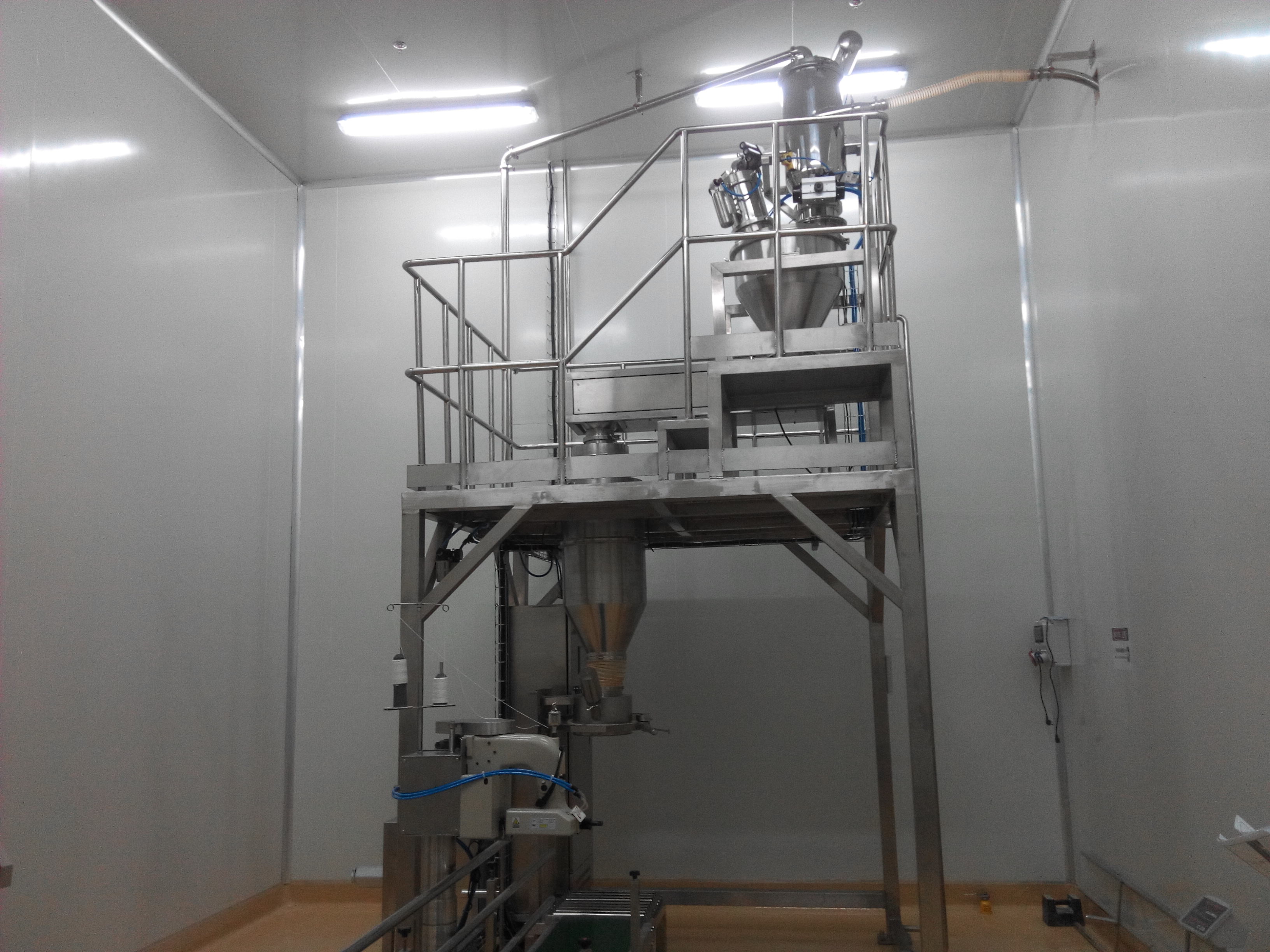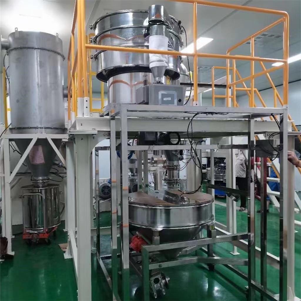1.小袋/吨袋投料站/自动拆包机:通过人工手动/机械自动,将袋内物料倒入一个箱体内。使用时,将投料口的门打开,打开物料包装,将所有物料依次投入投料站中。按动投料站启动按钮,真空泵开始工作,产生负压后物料通过管道抽至真空输送筒体内。